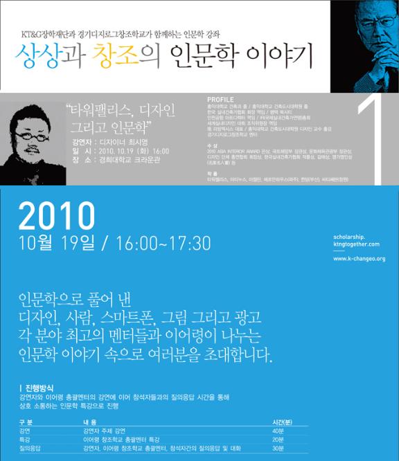 -강연자 최시영 디자이너는 건축·인테리어분야의 대표적 인물로, 인간과 자연의 조화를 모색하는 건축가로서 인문학에 대한 다양한 시각과 접근방법을 강의
