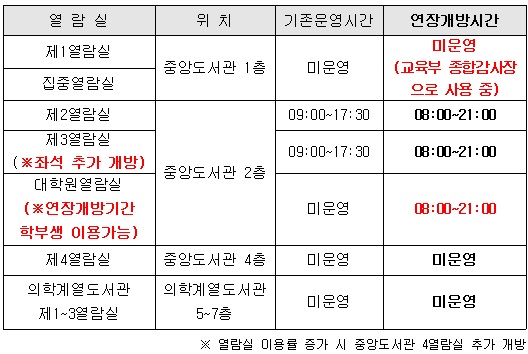 2020-1학기 기말고사기간 중앙도서관 열람실 연장개방 안내(수정_200602)